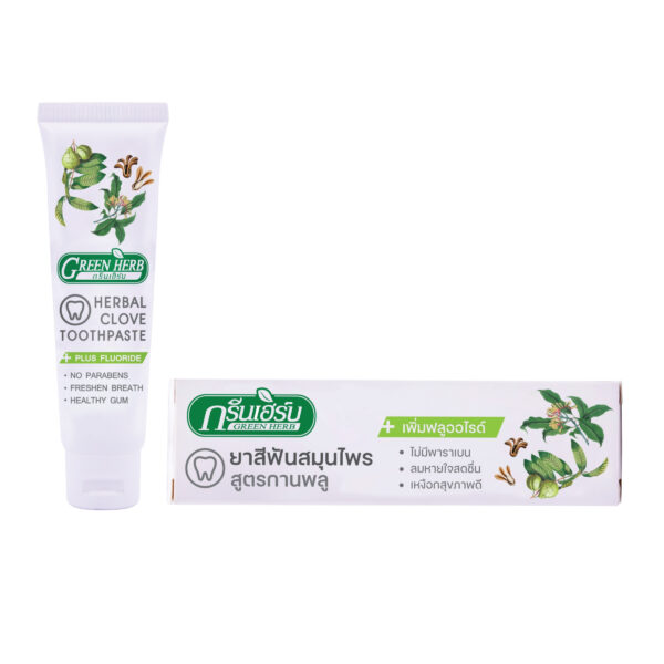 ยาสีฟันสมุนไพรเข้มข้นกรีนเฮิร์บ สูตรกานพลู ลดกลิ่นปาก ขจัดคราบเหลือง ลดอาการเสียวฟัน ลดเชื้อแบคทีเรีย ทำให้เหงือกและฟันสุขภาพดี เพิ่มฟลูออไรด์ป้องกันฟันผุ